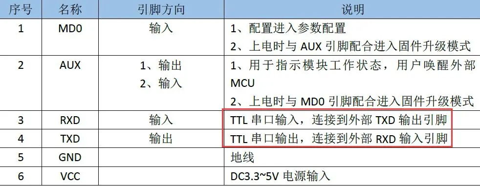 当退出配置功能( MD0=0 ),模块会重新配置参数,在配置过程中, AUX 保持高电平,完成后输出 低电平,模块返回 空闲 状态