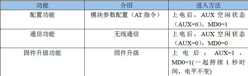 模块在初次上电时, AUX 引脚为输入状态模式,若 MD0 与 AUX 引脚同时接入 3.3V TTL 高电平,并且保持 1 秒时间(引脚电平不变),则模块会进入固件升级模式,等待固件升级。否则进入无线通信模式( AUX 引脚会变回输出状态模式,用于指示模块的工作状态)