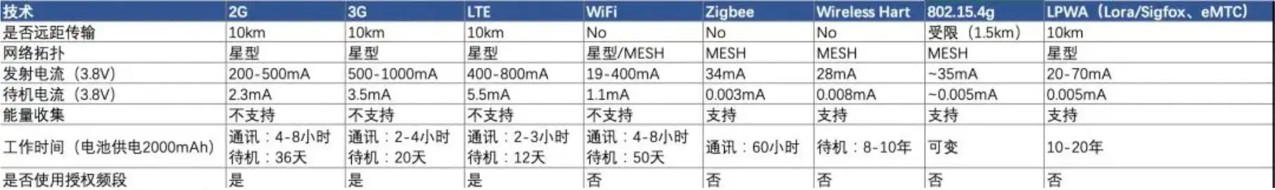 比较熟悉的无线通信技术包括 WIFI、蓝牙、ZigBee 等短距离无线通信技术、 2G、3G、4G 等移动蜂窝通信技术以及低功耗、广覆盖的 LPWA技术(如NB-IoT,Lora)等