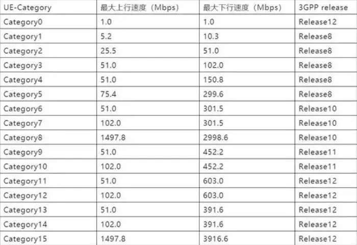 Cat.X 全称是 LTE UE-Category ,UE是 用户设备(user equipment), Category是分类、类别的意思。所以Cat.X这个值主要用来 衡量终端支持的传输速率的等级,根据 3GPP Release 定义, UE-Category 被分为 1-15 共 15 个等级,其中 Cat.1-5 在R8组, Cat.6-8 在R10组, Cat.9-10 在R11组, Cat.11-15 在R12组。目前我们手机所使用的LTE网络主要指的是 LTE Cat.4