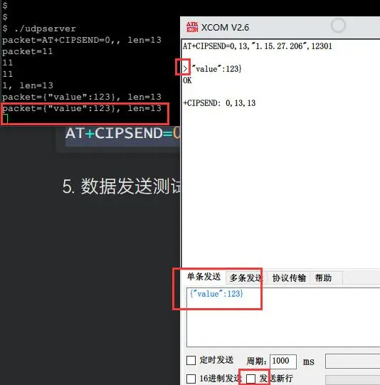 输入:AT+CIPSEND=0,13,"1.15.27.206",12301 返回: >