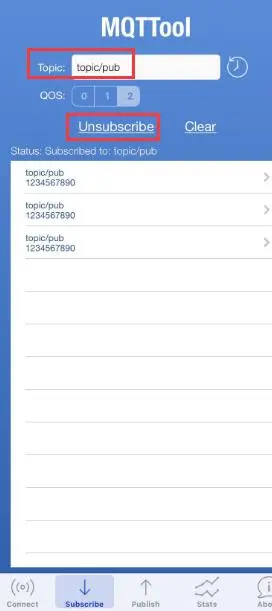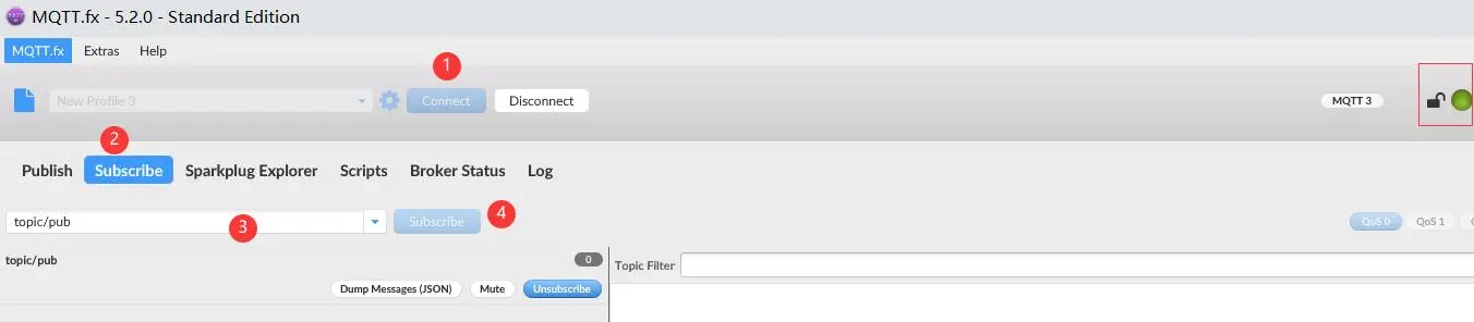 点击 Subscribe 选项卡,切换到主题订阅页面并输入主题 “topic/pub”,然后点击 Subscribe 按钮,订阅主题成功后, Subscribe 按钮会变成 Unsubscribe,电脑端MQTT.fx或者模块 就可以向这个主题发送消息了