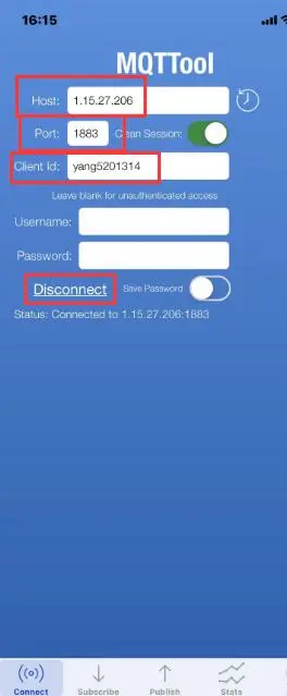 Host,Port,Client Id内容,开启【Clean Session】,点击【Connect】,连接远程服务器成功后,Connect按钮变成Disconnect