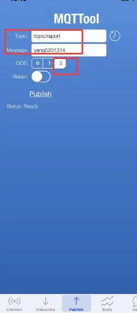 把获取到主题复制到主题输入框中,并且把以下代码字符串复制到发送框中,然后点击 Publish 按钮