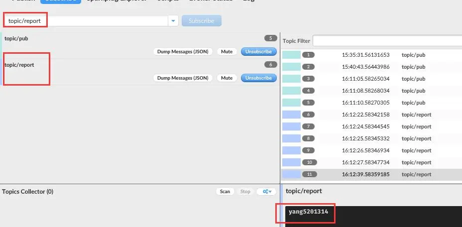 然后点击 Publish 就可以实现了往 topic/report 发送 yang5201314 这个消息了